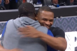 场下都是哥们儿!威少与德罗赞“围殴”追梦 随后三人大笑拥抱