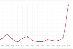 这张折线图展示了在2010年至2026年间,关键词“摆烂”在每1000条谣言中的提及次数的变化趋势。
